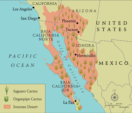 The most important thing to know about the Sonoran desert is that it is the home to the saguaro cactus. Despite its popularity and overuse in media, saguaro cacti are native only to the Sonoran desert. I cannot stress enough the importance of this fact. It is a pet peeve of mine to see other US deserts (or even deserts in other countries) depicted with saguaros growing in the wild. It is just plain wrong.