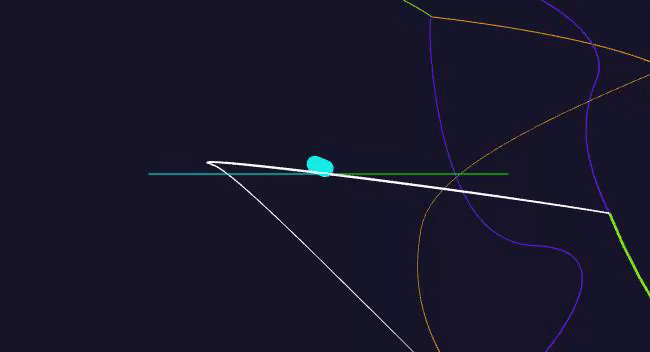 I’ve gotten it to work perfectly. But from a user interaction standpoint its not as intuitive as I would like it to be. There are specific instances at inflection points in the curves, where the input vector directions don’t really correlate very well with the curves, making for some awkward situations. For example, in the gif below I hold W to go forward on this curve, and at first it is going fine, but then I reach this bend in the curve where inductively I feel like holding forwards should still work, but instead I just stop dead. The bend in the curve is such that the closest point on the curve to my inputed direction, is the point I am already at.
