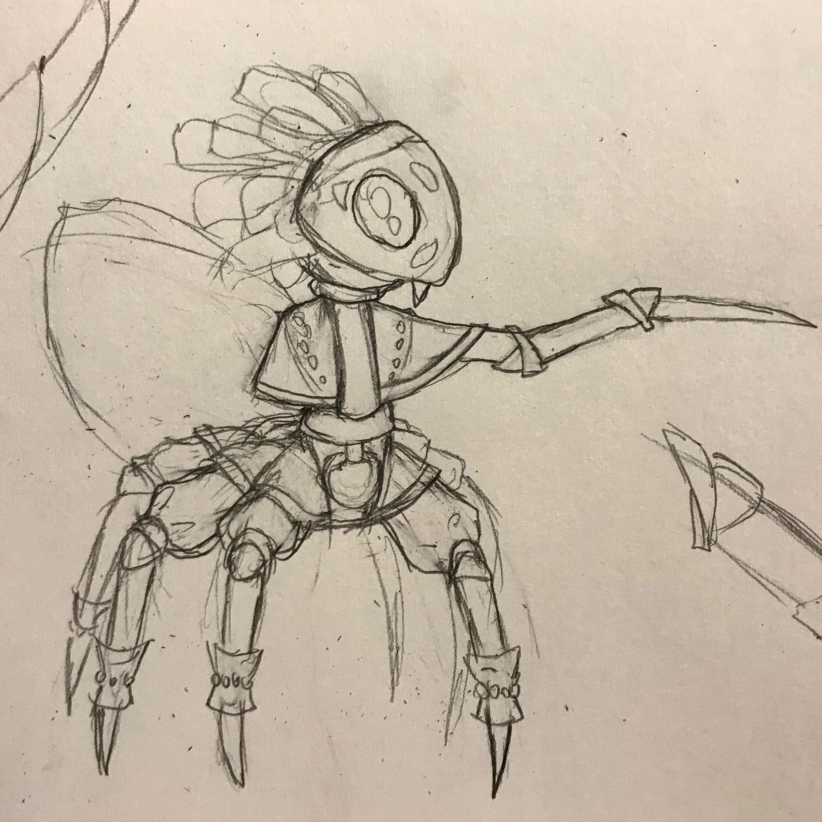 I showed the first deb blog to a friend and they said the current spider model looked creepy. I’m not sure I will be able to avoid that entirely, since its a spider, but I would like it to look more like Lucas than…creepy. So I made a little piece of bad concept art for a new spider person. I’m trying to base it on some vaguely African motifs to go with the Anansi theme.